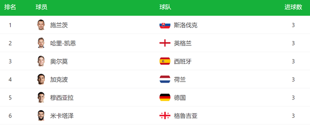 这一夜,欧洲杯也诞生了2大神奇纪录,其中施兰茨、凯恩、奥尔莫、加克波、穆西亚拉和米卡塔泽这6人,都打进3球,分享了本届的欧洲金靴。这是欧洲历史上,第一次6人同时拿到金靴。在决赛中,奥尔莫和凯恩都首发出场,可惜这2人都没能进球,因此只能与其他4人分享金靴。