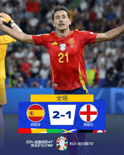 英格兰队在比赛第73分钟获得进球。这一次,依旧是替补闪光。帕尔默接到贝林厄姆的回传,禁区外一脚刁钻的低射打进远角。但让三狮没有料到的是,西班牙队的替补席上也坐着能决定比赛的球员。第86分钟,德拉富恩特换上的奥亚萨瓦尔接到库库雷亚利的传球,门前铲射入网。西班牙队在90分钟里击败英格兰队,展现了冠军之师的板凳深度。