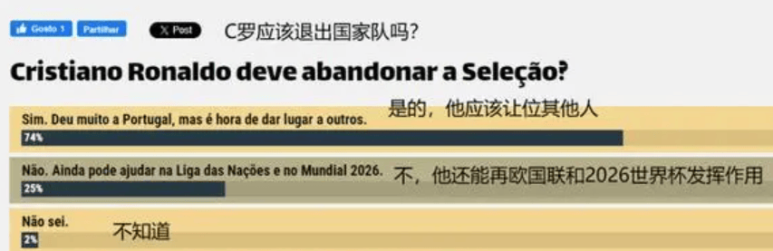 结果认为C罗应该退出的占了74%,觉得C罗能踢到2026世界杯的只有25%。如果按民意所向,难道C罗真该退出葡萄牙国家队了?