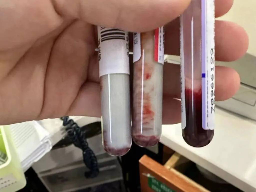 家人们急忙将他送往恩施市中心医院消化内科,经过来院后的紧急检查,他被确诊为高甘油三酯血症所致急性胰腺炎,此时,他的血液已经呈现出一种像牛奶一样的白色浑浊状态,这是因为他血液中的乳糜微粒含量极高。