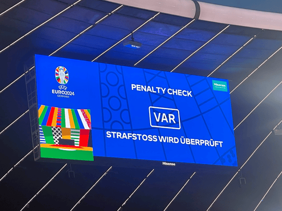 它就是,在欧洲杯第一场比赛的现场,通过VAR协助给出本届欧洲杯第一张红牌和第一个点球的,海信。