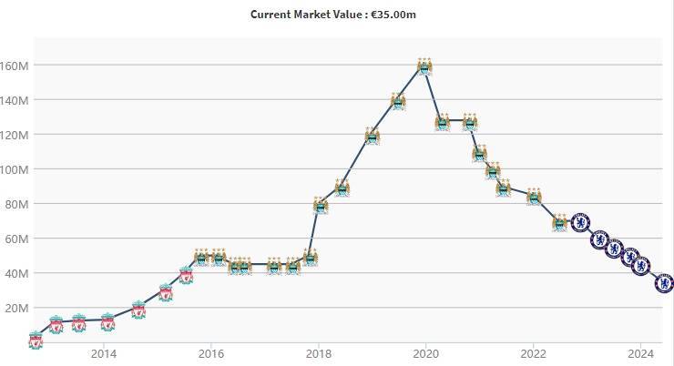 斯特林巅峰身价2019年的1.6亿欧,当时他效力于曼城,只有25岁。如今29岁的斯特林身价只剩3500万欧。