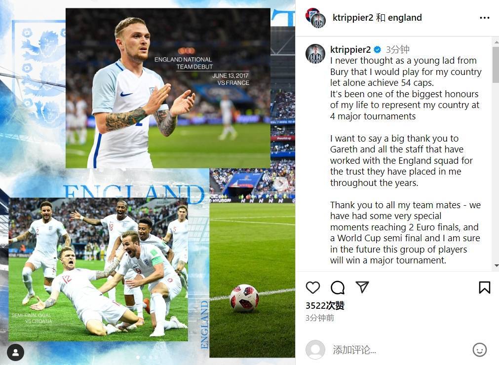 8月29日讯33岁的特里皮尔通过社交媒体宣布,自己从英格兰队退役。