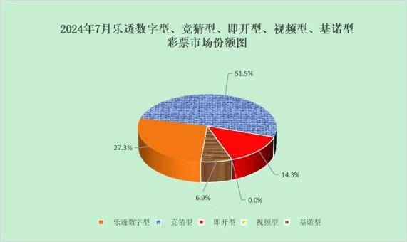 7月份,乐透数字型彩票销售149.27亿元,同比减少2.64亿元,下降1.7%;竞猜型彩票销售281.71亿元,同比增加92.89亿元,增长49.2%;即开型彩票销售77.98亿元,同比减少34.39亿元,下降30.6%;基诺型彩票销售37.59亿元,同比增加1.64亿元,增长4.6%。7月份,乐透数字型、竞猜型、即开型、基诺型彩票销售量分别占彩票销售总量的27.3%、51.5%、14.3%、6.9%。视频型彩票销售0.0013亿元,同比减少0.0001亿元。